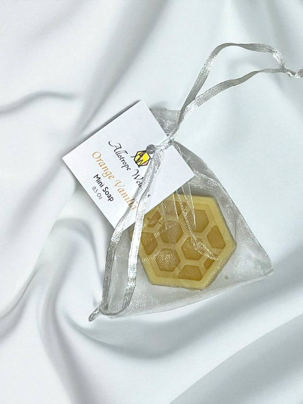 Mini Soaps are approximately 1.5" across, have a net weight of 0.5 oz, and are a hexagon shape with either a honeycomb or bee on top.