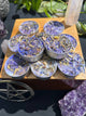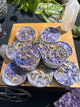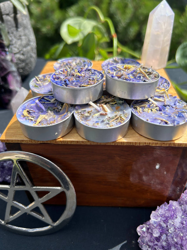 Each tealight spell candles may vary slightly in appearance because each is handmade by me. Each spell candle is filled with herbs, flowers, anointing oil, crystals and all my intentions. Hold and focus your intentions. Feel your third eye opening and all you need to know coming in focus. Trust your self and your intuition. Imagine a bubble of energy surrounding you and protecting you from negative energies and outside influences. Intention and manifestation are everything. Spell candles can be used in rituals, spells, or just filled with your intentions and burned. *Please supervise all open flames! Never leave unattended!*