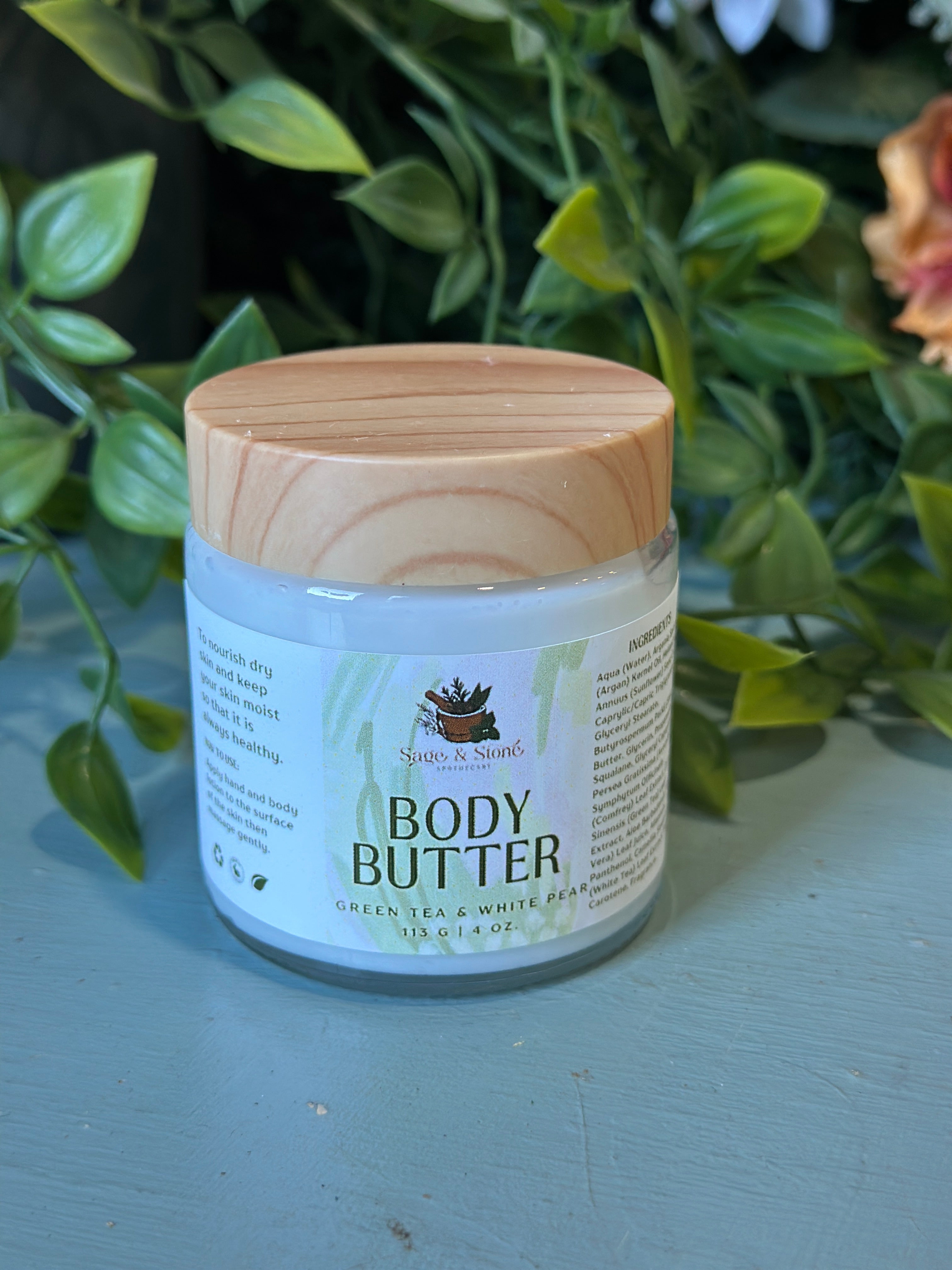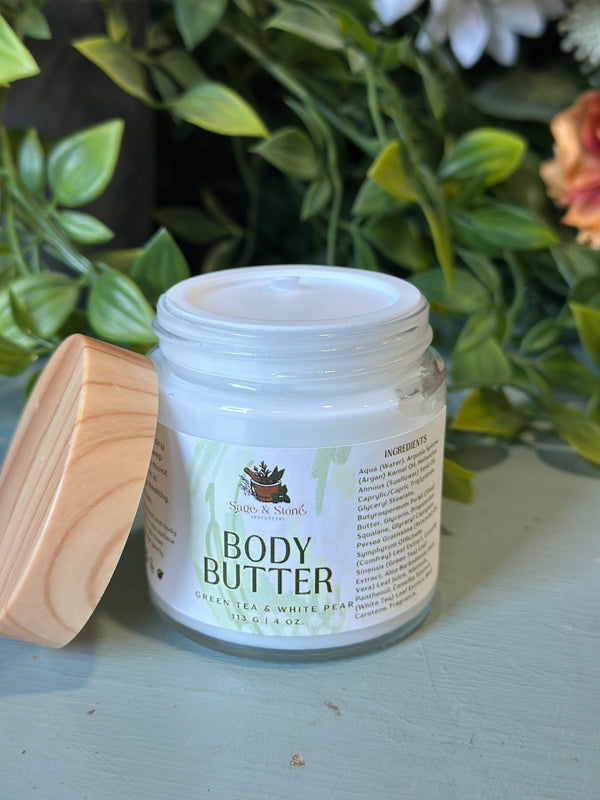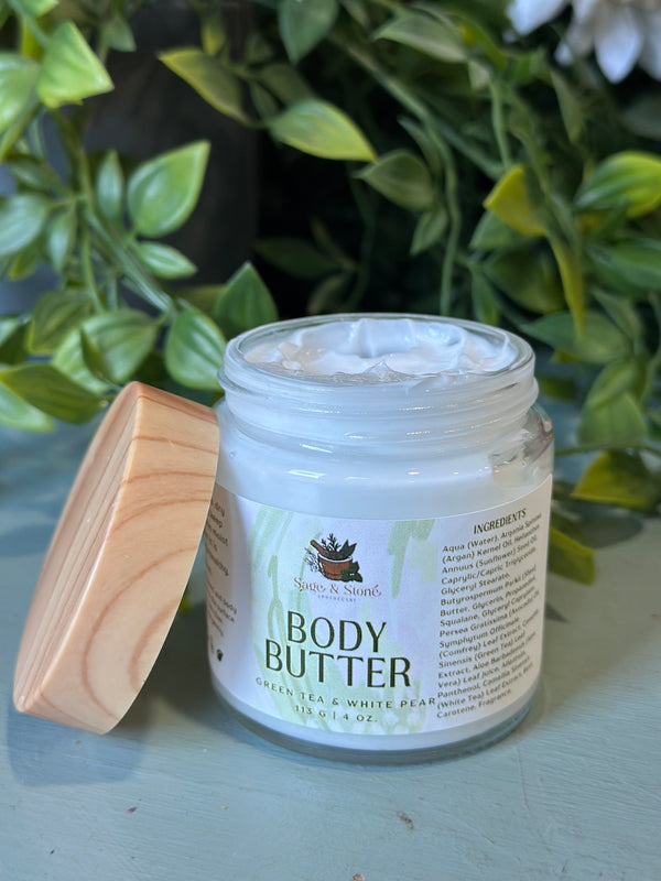 Experience deep nourishment with our Green Tea & White Pear Argan Oil Body Butter. This rich blend harnesses the antioxidant properties of green tea and the subtle freshness of white pear to soothe and revitalize skin. Infused with argan oil, it delivers intense hydration, helping to restore softness and improve elasticity. Ideal for daily use, this body butter supports skin’s natural barrier, leaving it feeling smooth, balanced, and refreshed. Perfect for anyone seeking expert-level skincare with natural, effective ingredients.