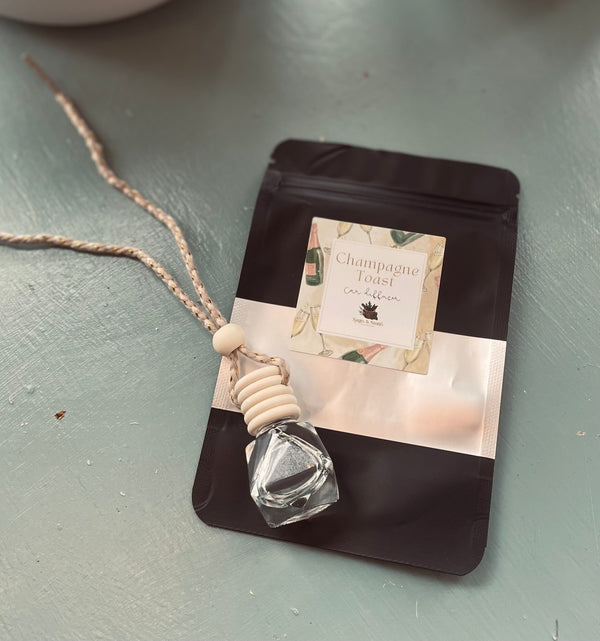 Introducing the Champagne Toast Hanging Car Diffuser - the perfect way to enjoy the luxurious scent of champagne in your car. Made with high-quality ingredients, this diffuser will transform your car into a sophisticated and elegant oasis. With its stylish design and long-lasting fragrance, you can indulge in the benefits of champagne anytime, anywhere.