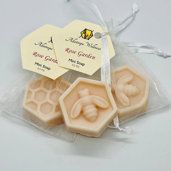 Our mini soaps are approximately 1.5" in diameter, weigh 0.5 oz, and feature a hexagonal shape with either a honeycomb or bee design on top.
