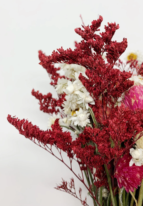 Introducing our Holiday Eucalyptus Bundle - perfect for smoke clearing or festive addition to your space! Featuring vibrant green eucalyptus adorned with cheerful red "berry" blooms, this bundle brings a holiday spirit to any occasion. Whether you use it for smoke cleansing or as a decorative floral accent, it's sure to elevate your ambiance. Please note that the photo shows the blooms, not the actual bundle. Details include round leaf eucalyptus, babies breath/wildflowers, red/wine gomphrena/red "berry" blooms, and red limonium, all lovingly wrapped with cotton twine. An instruction card on how to burn your bundle is included for your convenience.