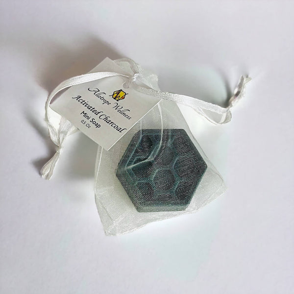Our mini charcoal soap bar is the perfect size for use as a facial soap or for travel.