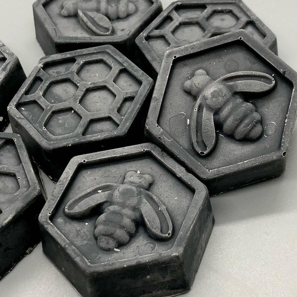 Mini Soaps are approximately 1.5" across, have a net weight of 0.5 oz, and are a hexagon shape with either a honeycomb or bee on top.