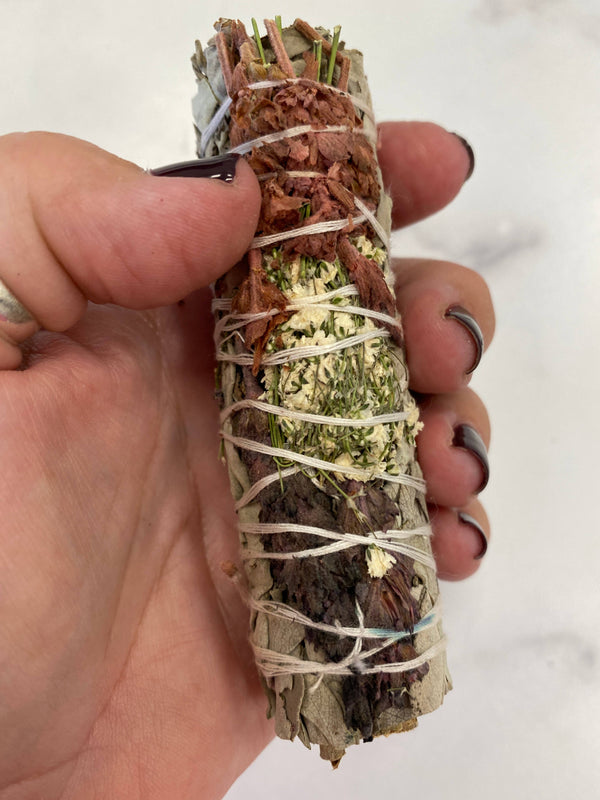 Natural flowers are placed on sage bundle, bundles may have slight variation in color.