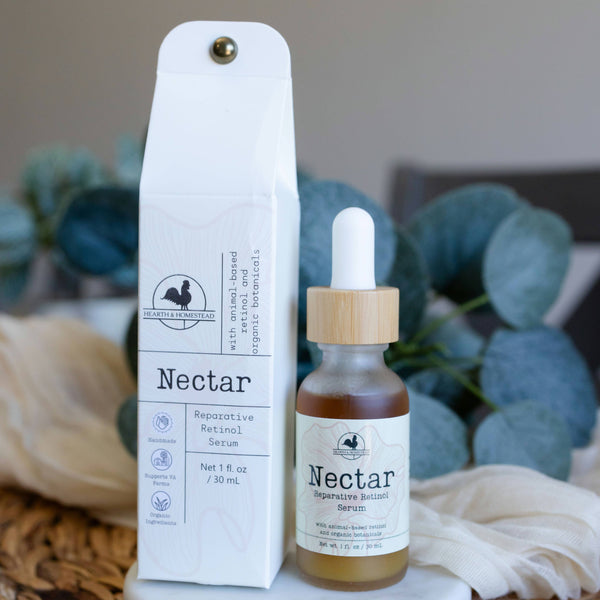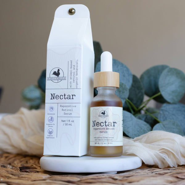 Nectar Retinol Serum is made to support healthy skin for every age and skin type. The animal-based oils in this blend are light and absorbable, as well as nutrient dense for your skin, whether oily and acne-prone, or dry or aging.