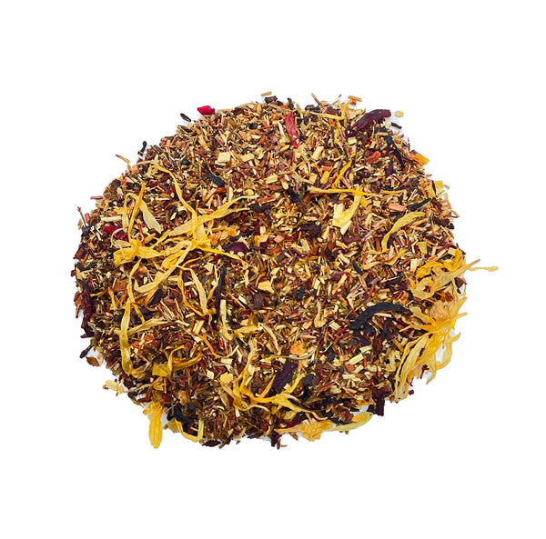 Ingredients: Green Rooibos, honey bush, hibiscus flower, marigold petals, orange peel, raspberries, pomegranate, strawberries, and natural flavoring