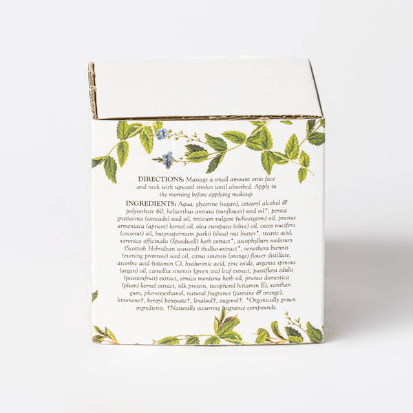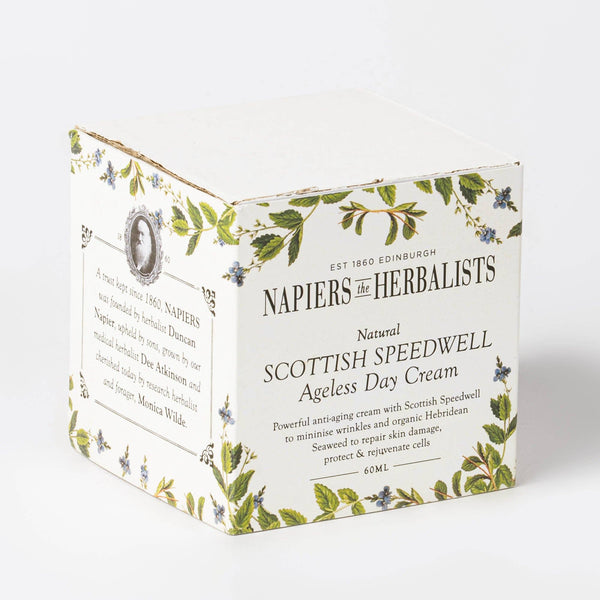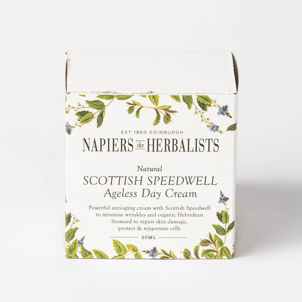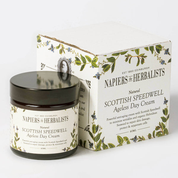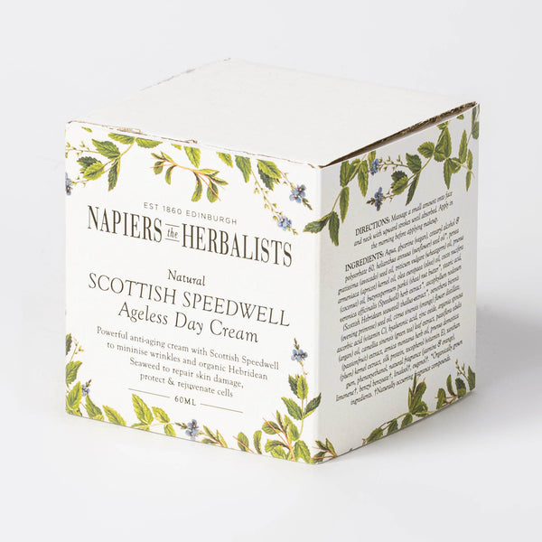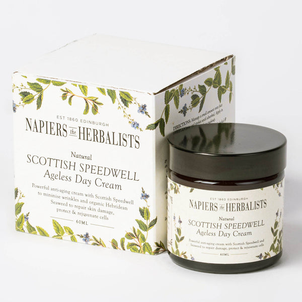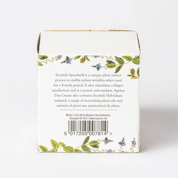 Scottish Speedwell Veronica officinalis is a unique plant extract that has been proven to visibly reduce wrinkles when used for a 4 week period. We have also added organic knotted wrack kelp Ascophyllum nodosum, sustainably gathered from the Scottish Islands of the Outer Hebrides. Speedwell also stimulates collagen production and is a potent anti-oxidant. Ageless Day Cream also contains a range of nourishing plant oils: avocado, wheatgerm, apricot, olive, coconut, shea, evening primrose, argan and arnica oils. And extracts of green tea, passionfruit and plum.