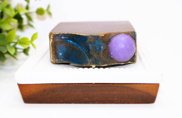 Amethyst Sunset is a limited-edition summer soap. It is a handmade vegan soap bar scented with a perfume dupe Delicia Drench Cheriosa 59 by Sol de Janeiro. This soap is topped with glycerin soap gum ball and leaf. This soap is vegan (no animal products) and doesn't contain any palm oil. Net weight approximately 5 oz. All soaps are made by using the cold process method. Bars are hand-cut, trimmed, and allowed to cure for 6 weeks. Because we make soap in small batches, design, weight, and colors vary slightly from bar to bar.