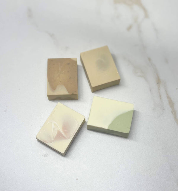 Each mini soap is crafted with a nourishing base of saponified olive oil, organic coconut oil, and organic shea butter. These bars feature an array of natural ingredients, which may include essential oils, oatmeal, espresso, chai tea, cocoa powder, green clay, rhassoul clay, bentonite clay, pink clay, non-nano zinc oxide, activated charcoal, calendula petals, turmeric, or cinnamon.
